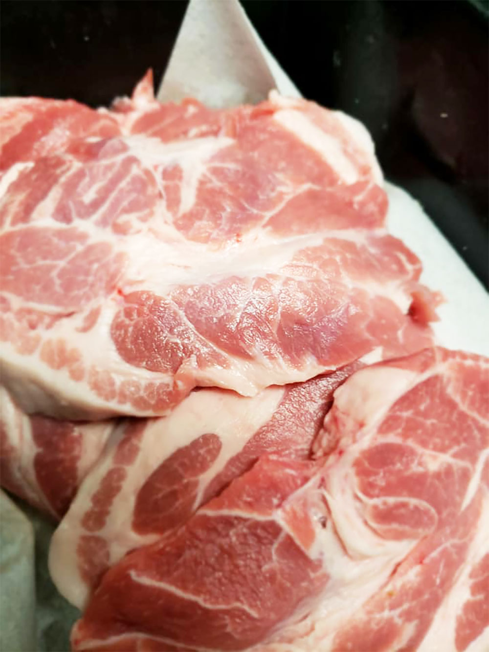 咲々豚々の豚はレアでも食べられる健康豚を使用しています。豚肉の色(新鮮な豚肉はきれいなピンク色)、脂肪と赤身肉の割合、肉の締まり具合の3点の検査項目をクリアした豚肉を使用。オーダーされてからお肉をカットしますので、鮮度も最適なまま提供しております。